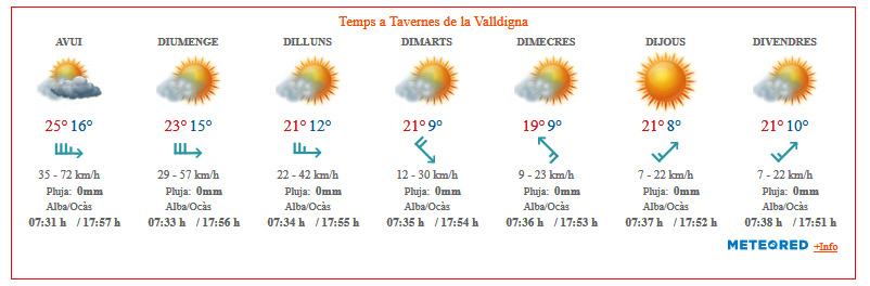 En resum i a casa nostra: AEMET preveu per avui un cel amb poc núvols clars en la zona sud del País Valencià (la nostra) i a la resta núvols amb possibilitat d’algun ruixat. Temperatures que avui pujaran i vent moderat de l’oest i sud-oest, que esperem i desitgem permeten avançar en el control de l’incendi de Montixelvo. La nostra solidaritat amb els pobles afectats.