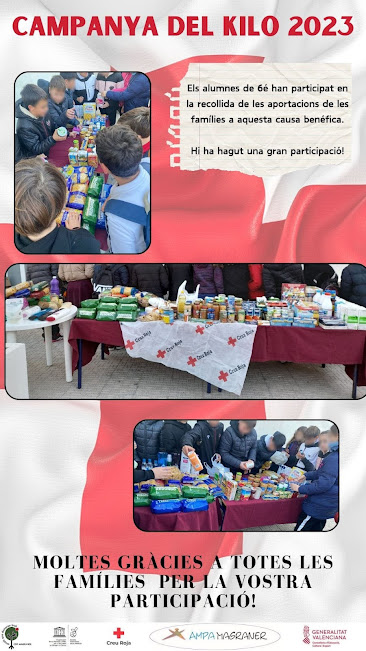 El CEIP Magraner ha dut a cap diverses activitats solidàries dins dels actes d'acabament del trimestre escolar. Els alumnes del centre, i en especial els de 6é de primària que han estat els encarregats de recollir les aportacions, ha finalitzat amb molt d'èxit un any més la "Campanya del quilo" dirigida a l'alumnat i famílies del centre.