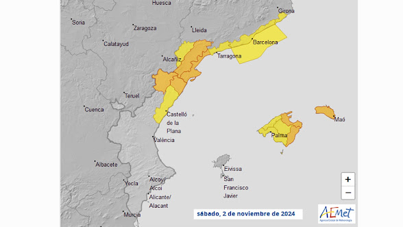 AEMET no preveu grans pluges a la nostra zona. La DANA continua en el seu camí per la costa del Mediterrani, però ara els avisos, groc i de taronja, com podeu vore en el mapa superior, queden en aquestes hores del matí circumscrits a el nord de Castelló (avisos gros i taronja), la costa catalana, especialment les comarques del sud i centre de Tarragona amb avís taronja i les illes de Mallorca i Menorca, que ahir patien els màxims ruixats a la vesprada.